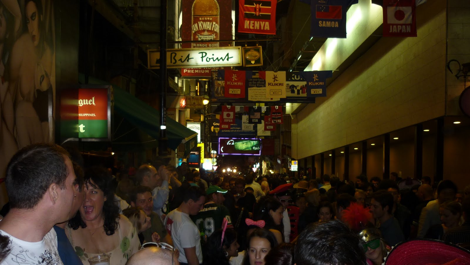 After the day's matches are over everyone grabs some food somewhere between the stadium and Lan Kwai Fong. LKF is usually very busy on weekends but on the weekend of the Sevens you can barely walk through the packed street. It's a massive street party and everyone is on the piss!